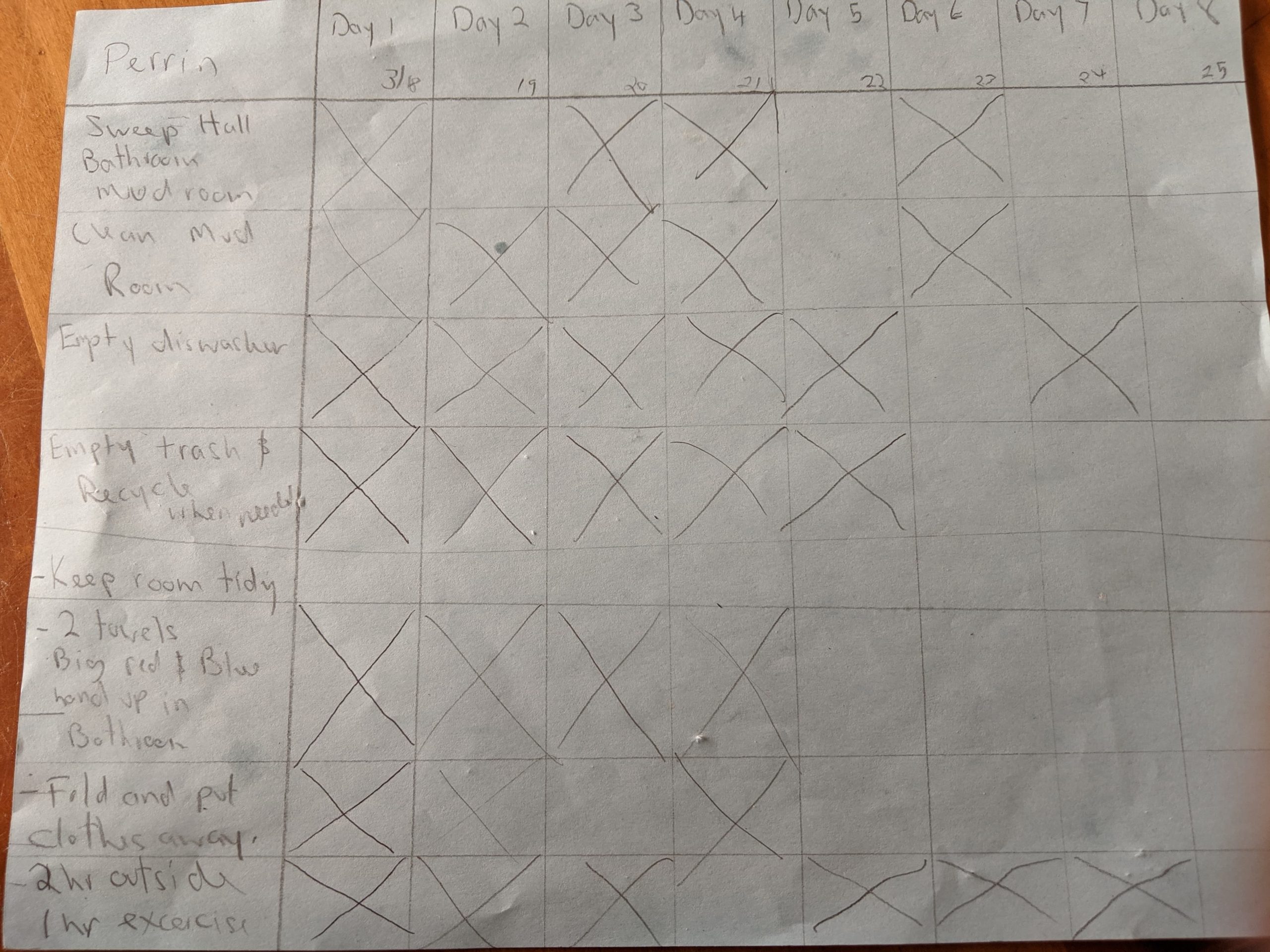 A sample of chores on Perrin and Sylvie’s chart include emptying the dishwasher, sweeping the floor, taking the trash out. Additionally, they are responsible for personal things. They also need to keep their rooms tidy, fold and put away their own clothes, and spend at least 2 hours outside. Each parent will need to determine age appropriate chores based on their child’s age. However, remember camp age children can do a lot!