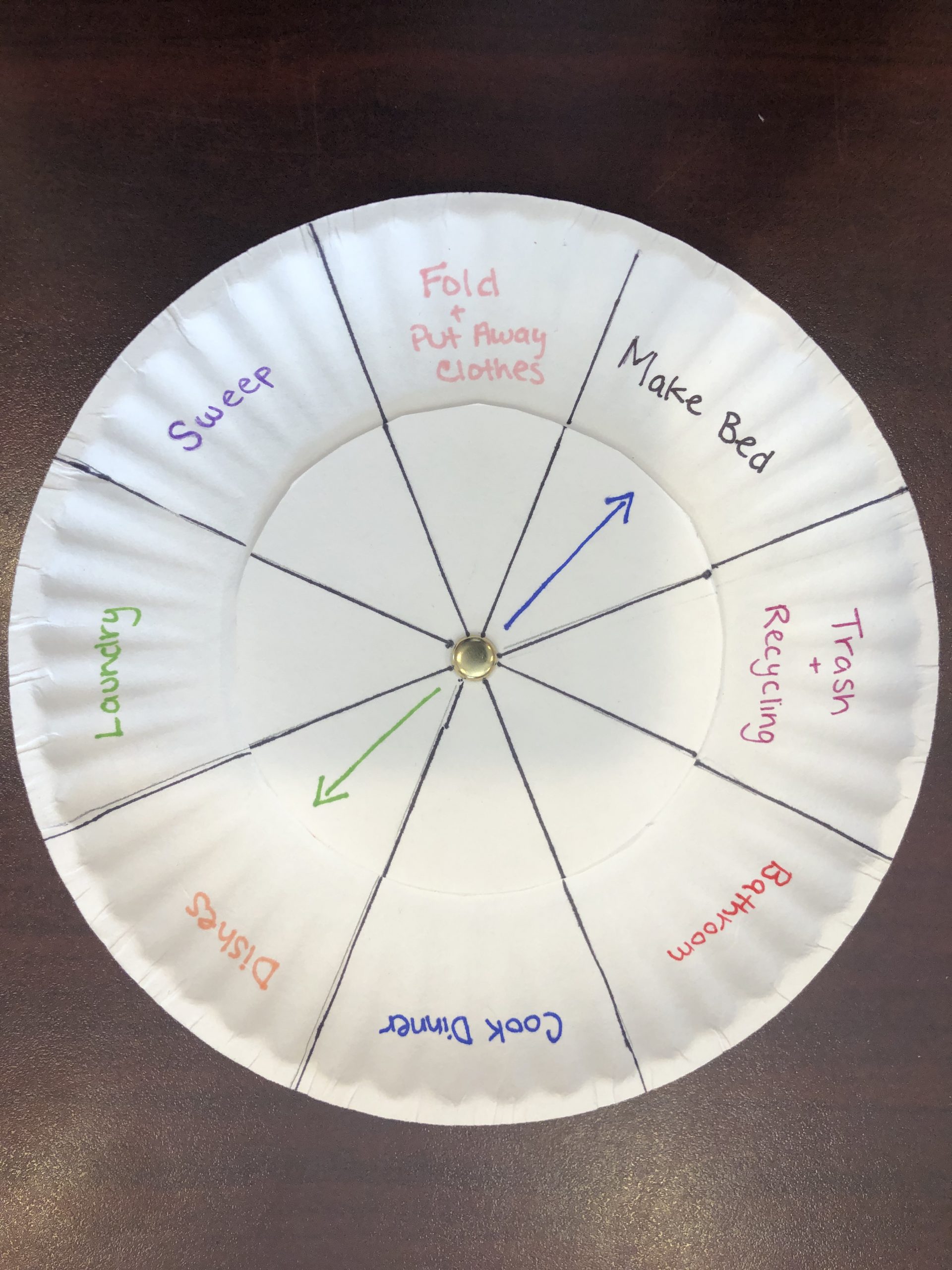 During the summer each bunk has a chore/job wheel that the campers and counselors create. It includes the chores that need to be done daily during morning clean-up. Such items include sweeping the floor, emptying the trash and recycling bins, cleaning the bathroom sink, tidying the porch, and organizing the clothesline.